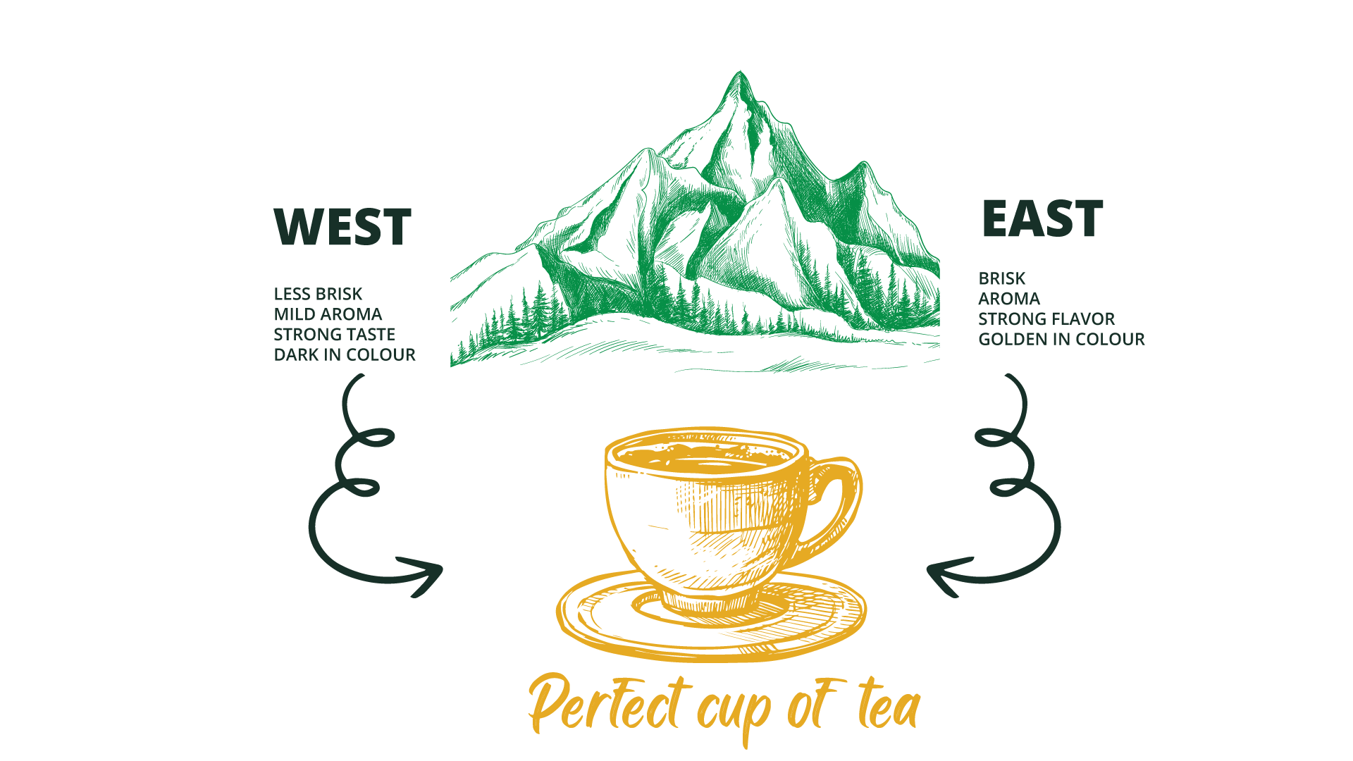 Stretching towards the East, lies lighter, brighter, toned tea leaves embodied with the freshest aromas. While to the West sits darker, bolder tea leaves belted with a rich and powerful taste. When East meets West – A harmonized balance of flavour, colour and scent is created.